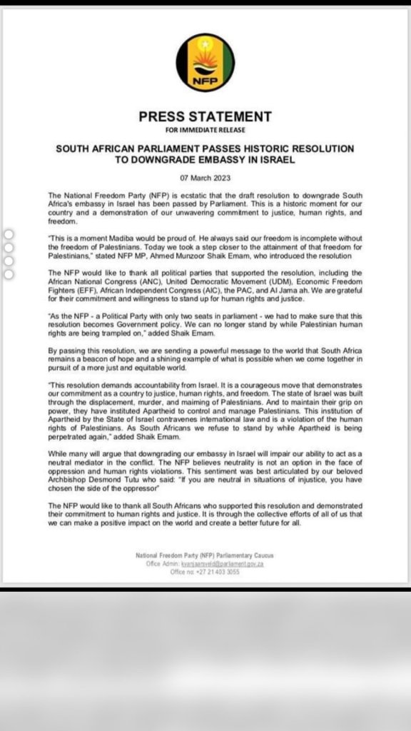 BREAKING: The South African Parliament passes a historic resolution to downgrade South Africa’s embassy in Israel.